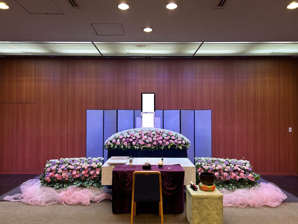 今回はご家族のご希望で、淡いピンクと紫を基調とした温かみのある祭壇をご用意いたしました。